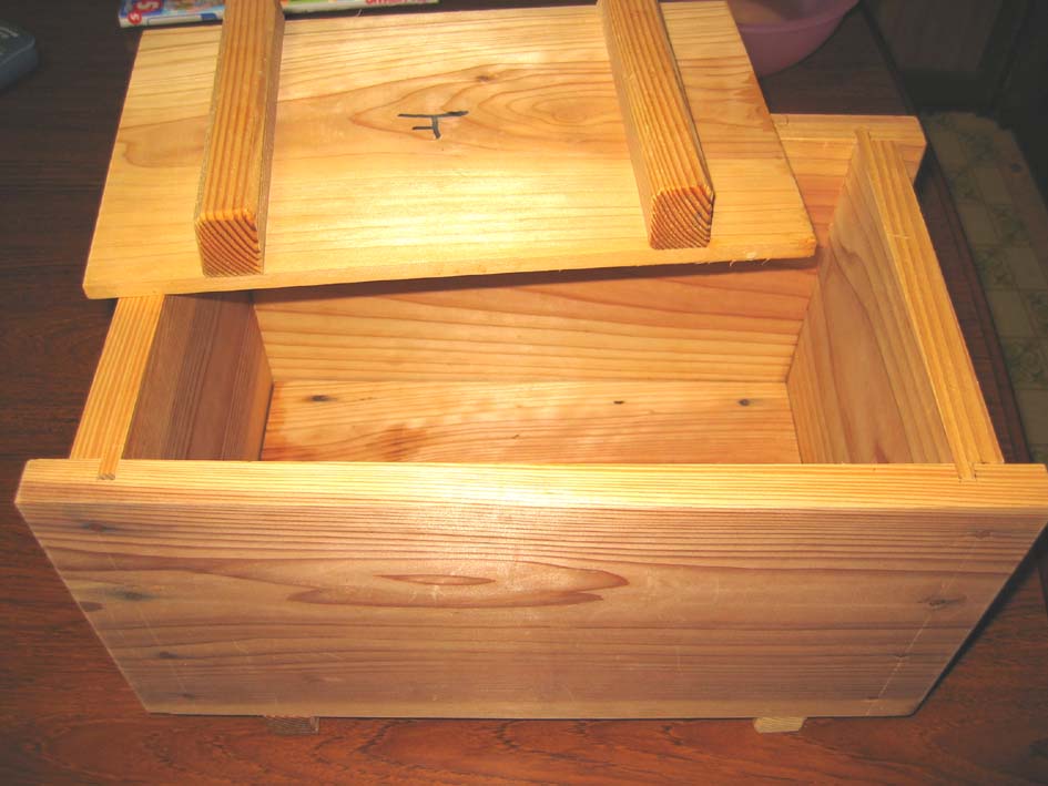何層かになったら、木の蓋に重石を載せて出来上がりです。