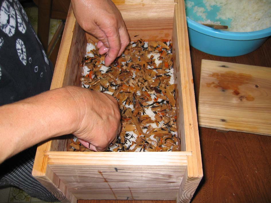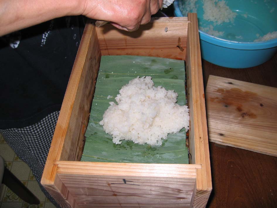 木箱に用意した青笹を敷き並べ、酢飯を一定の厚さで押し広げます。